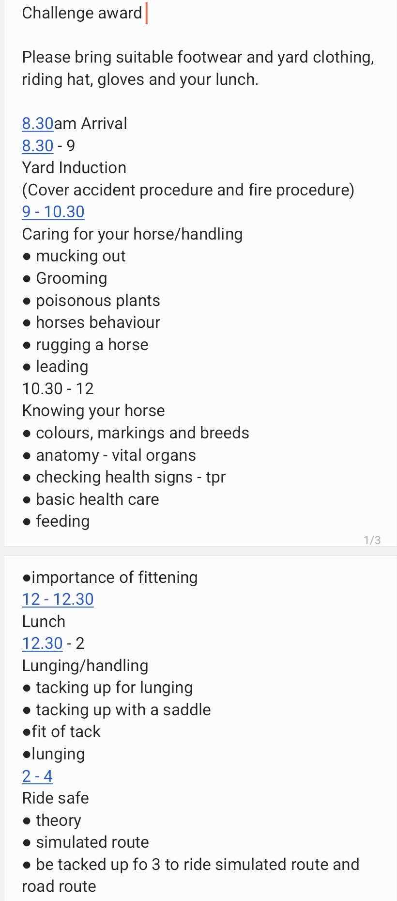 This day training camp will cover all aspects of the about the horse (care) silver challenge award. (Other than for the ride safe this is a none ridden camp, the riding sections can be signed off via private ridden session on riders own horses at another time) for those who have access to and would like to bring their own horses in on the afternoon to be able to complete the ride safe award this will be a option, (stables not provided, horses would need to stay with the trailers) please state on the notes when entering if you would like to do the ride safe part of the award. It will include a simulated road route ridden in the arena and a small hack around the auction. For those that would not like to do the rider part of the ride safe they can still complete the theory and the training towards the certificate.